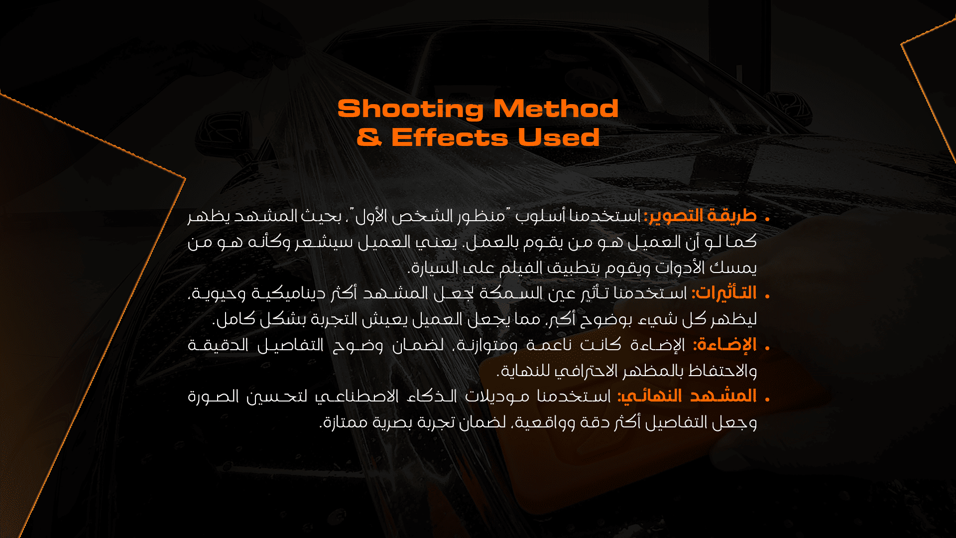 تقدم حلولاً متكاملة في مجال عناية السيارات وأحدث تقنيات أفلام الحماية، لنضمن لعملائك تجربة تجمع بين الجودة والاحترافية. نوفّر خدمات العناية الداخلية والخارجية، تلميع وحماية الطلاء، إضافة إلى تركيب أفلام الحماية الشفافة وحرارية العزل الحراري بمعايير عالية.